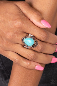 Pressed into a textured copper teardrop frame, a refreshing turquoise stone stands out atop the finger. Airy hoops and studded lines frame the bottom of the teardrop for additional texture. Features a stretchy band for a flexible fit.
